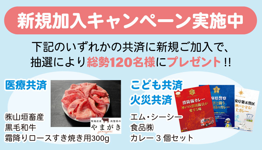 期間中、対象共済(医療共済・こども共済・火災共済)のいずれかに新規ご加入いただいた方を対象に、抽選で総勢120名様へ、下記のキャンペーン特典をプレゼントいたします。